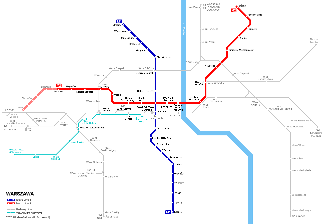 В настоящее время Варшавский метрополитен состоит из двух линий метро: